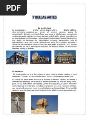 Desde pintura y escultura, pasando por la arquitectura hasta llegar a la música, hemos preparado una lista de las mejores creaciones de las 7 bellas artes que no puedes dejar de ver y oír.. Esta se puede definir como arte o ciencia de proyectar y construir edificios perdurables en el tiempo, que cumplan una función y proyectar placer estético o admiración al espectador. sin embargo, tiene una visión profunda como las demás bellas artes, esta hace que se tenga una visión más profunda de las estructuras, como... Jan 16, 2017 · las 7 bellas artes: